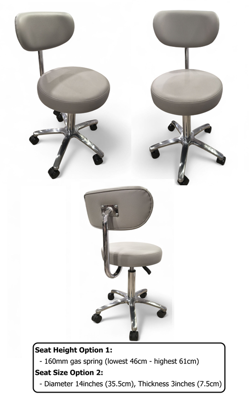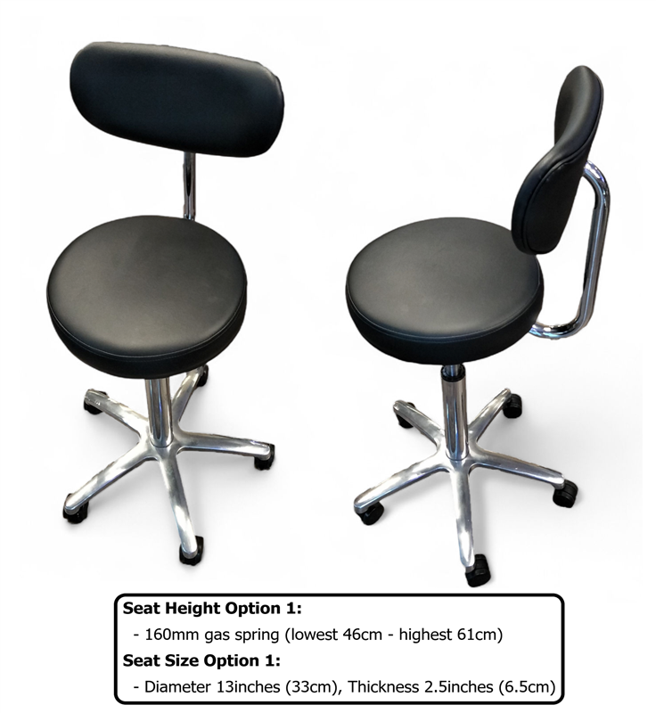 Note: Standard height and size is Option 1: Adjustable Height using 160mm gas spring (lowest 46cm - highest 61cm), with seat Diameter 13inches (33cm) and Thickness 2.5inches (6.4cm).