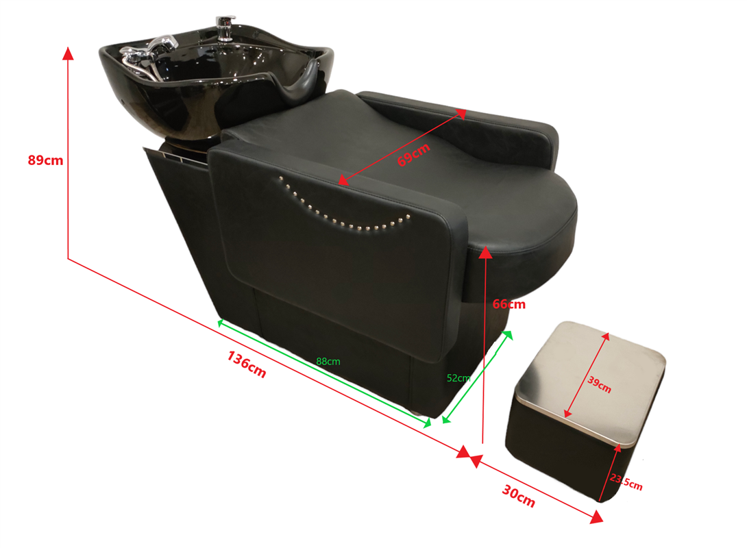 - Fully upholstered shampoo chair with metal studs lining design near armrest