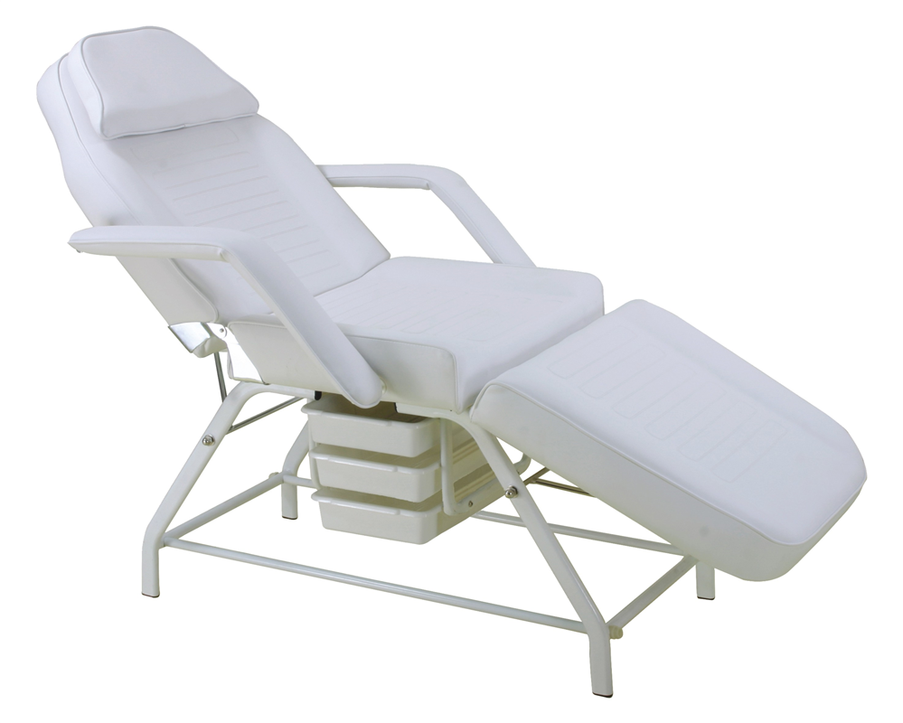 Facial Bed with white bed, white frame and 3-tier storage trays.